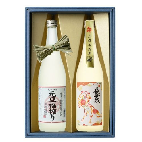 今年の干支をモチーフにしたラベルのお酒と元旦に絞った「元旦福搾り」をセットにしました。化粧箱に入っているので贈答品にも向いています。